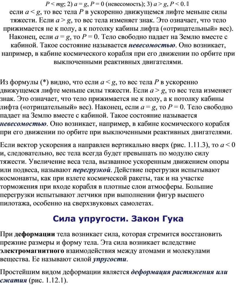 Из формулы (*) видно, что если a < g, то вес тела P в ускоренно движущемся лифте меньше силы тяжести. Если a > g, то вес тела изменяет знак. Это означает, что тело прижимается не к полу, а к потолку кабины лифта («отрицательный» вес). Наконец, если a = g, то P = 0. Тело свободно падает на Землю вместе с кабиной. Такое состояние называется невесомостью. Оно возникает, например, в кабине космического корабля при его движении по орбите при выключенными реактивных двигателями.