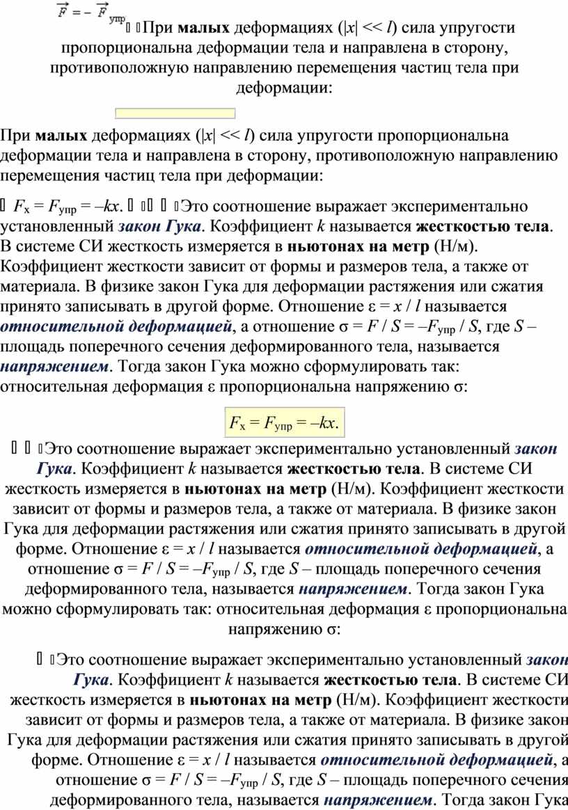 Это соотношение выражает экспериментально установленный закон Гука. Коэффициент k называется жесткостью тела. В системе СИ жесткость измеряется в ньютонах на метр (Н/м). Коэффициент жесткости зависит от формы и размеров тела, а также от материала. В физике закон Гука для деформации растяжения или сжатия принято записывать в другой форме. Отношение ε = x / l называется относительной деформацией, а отношение σ = F / S = –Fупр / S, где S – площадь поперечного сечения деформированного тела, называется напряжением. Тогда закон Гука можно сформулировать так: относительная деформация ε пропорциональна напряжению σ: