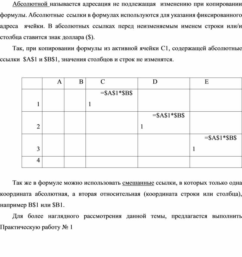 Так же в формуле можно использовать смешанные ссылки, в которых только одна координата абсолютная, а вторая относительная (координата строки или столбца), например B$1 или $В1.