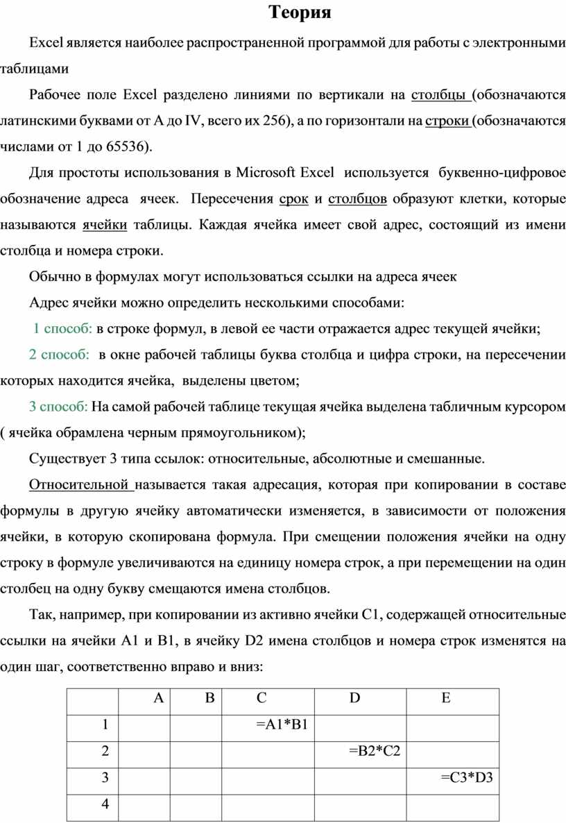 Так, например, при копировании из активно ячейки С1, содержащей относительные ссылки на ячейки А1 и В1, в ячейку D2 имена столбцов и номера строк изменятся на один шаг, соответственно вправо и вниз: