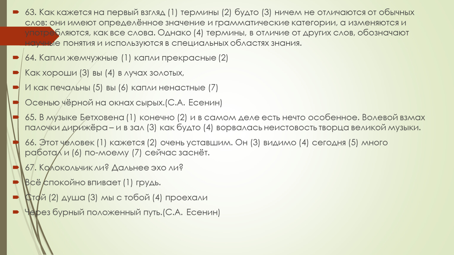 63. Как кажется на первый взгляд (1) термины (2) будто (3) ничем не отличаются от обычных слов: они имеют определённое значение и грамматические категории, а изменяются и употребляются, как все слова. Однако (4) термины, в отличие от других слов, обозначают научные понятия и используются в специальных областях знания.