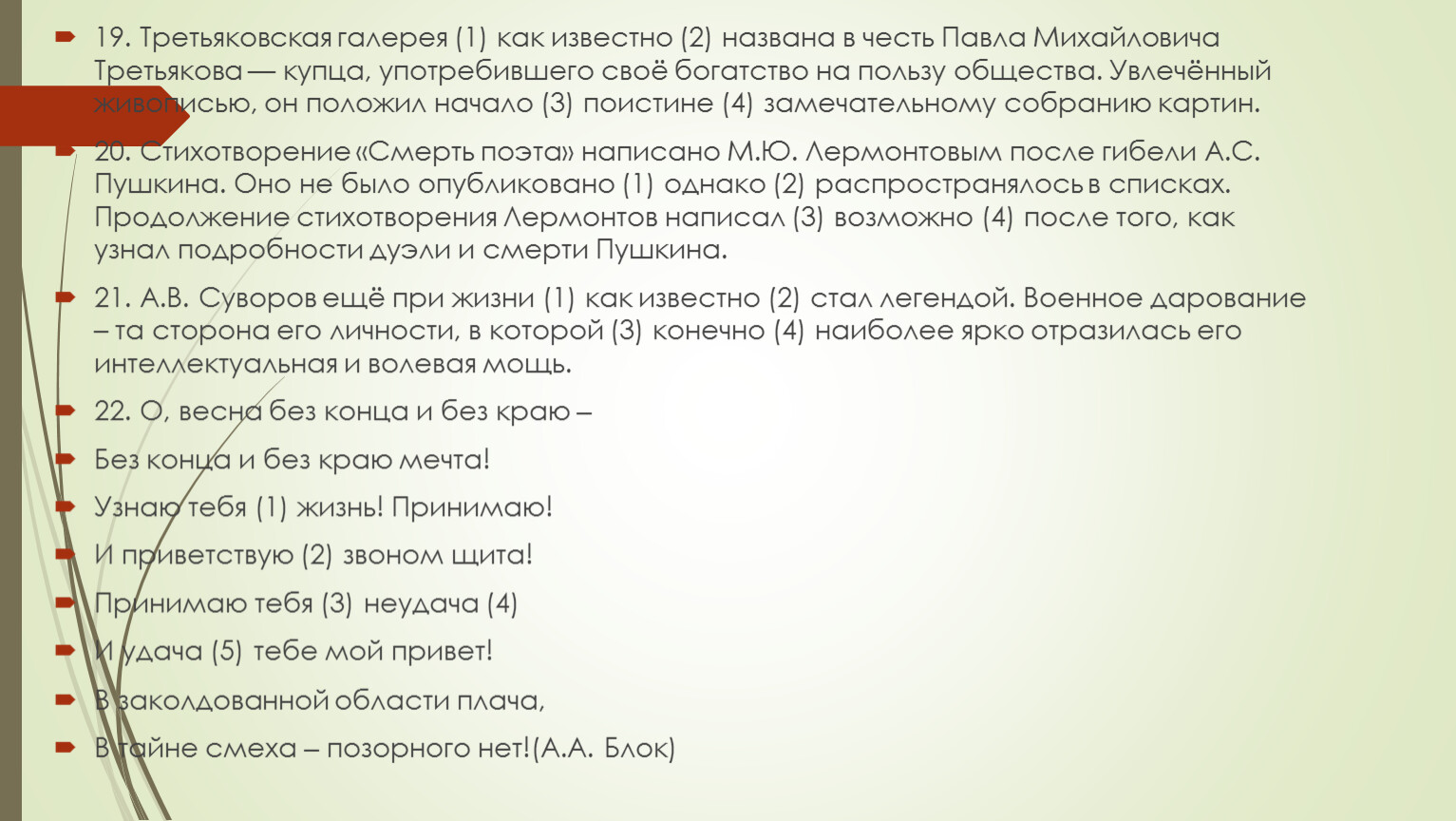 20. Стихотворение «Смерть поэта» написано М.Ю. Лермонтовым после гибели А.С. Пушкина. Оно не было опубликовано (1) однако (2) распространялось в списках. Продолжение стихотворения Лермонтов написал (3) возможно (4) после того, как узнал подробности дуэли и смерти Пушкина.