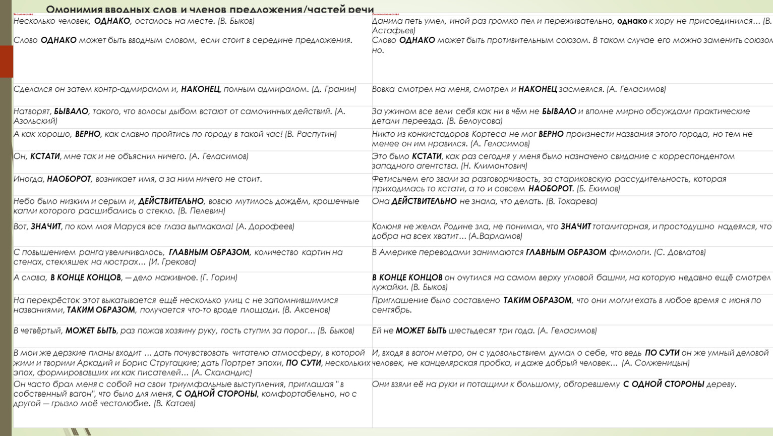 Связь мыслей, последовательность их оформления | в довершение всего, в конце концов, вместе с тем, в общем, во-первых, во-вторых (и т. д.), во всяком случае, впрочем, в частности, главное, главным образом, значит, итак, к примеру, кроме того, кстати, к слову сказать, наконец, например, напротив, одним словом, помимо этого, прежде всего, следовательно, с одной стороны, с другой стороны, таким образом, тем не менее… |