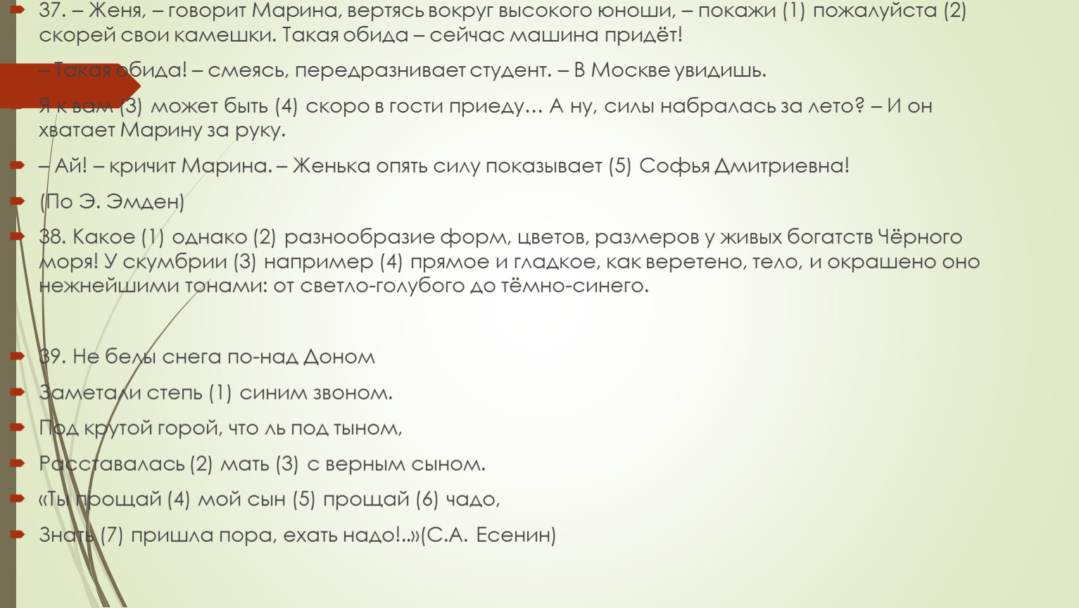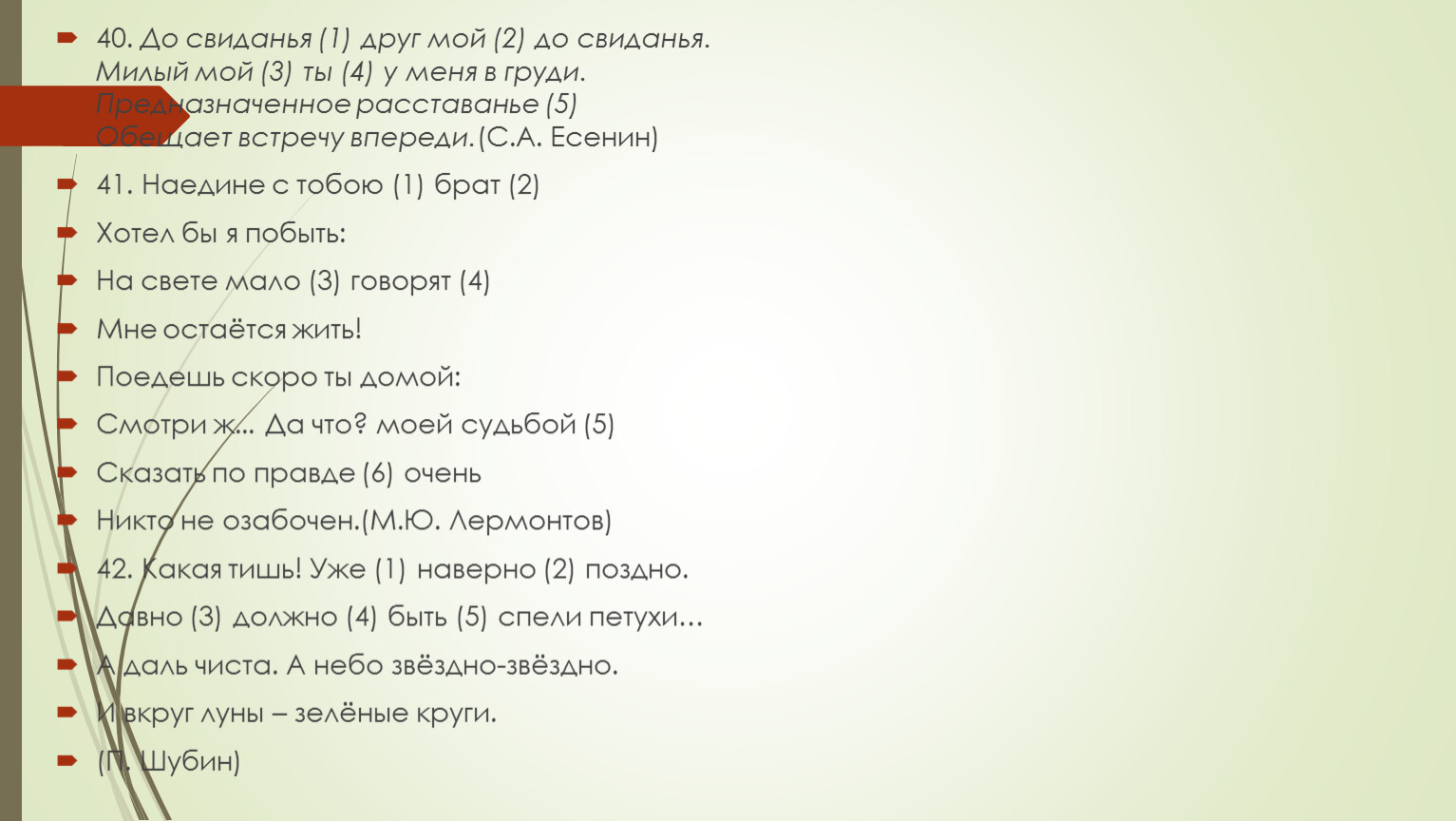 40. До свиданья (1) друг мой (2) до свиданья.Милый мой (3) ты (4) у меня в груди.Предназначенное расставанье (5)Обещает встречу впереди.(С.А. Есенин)