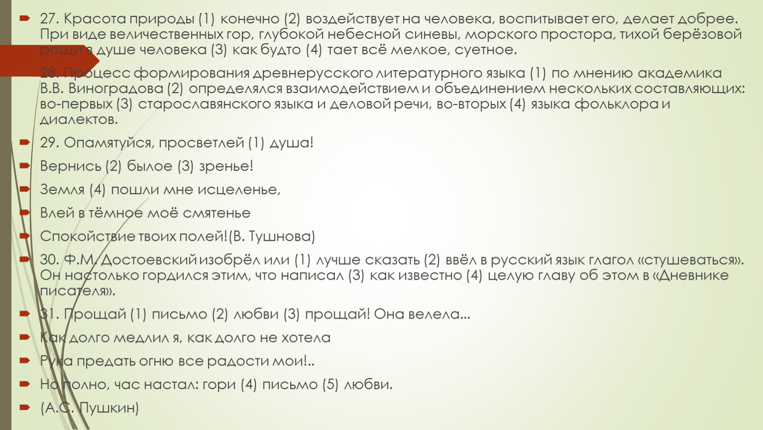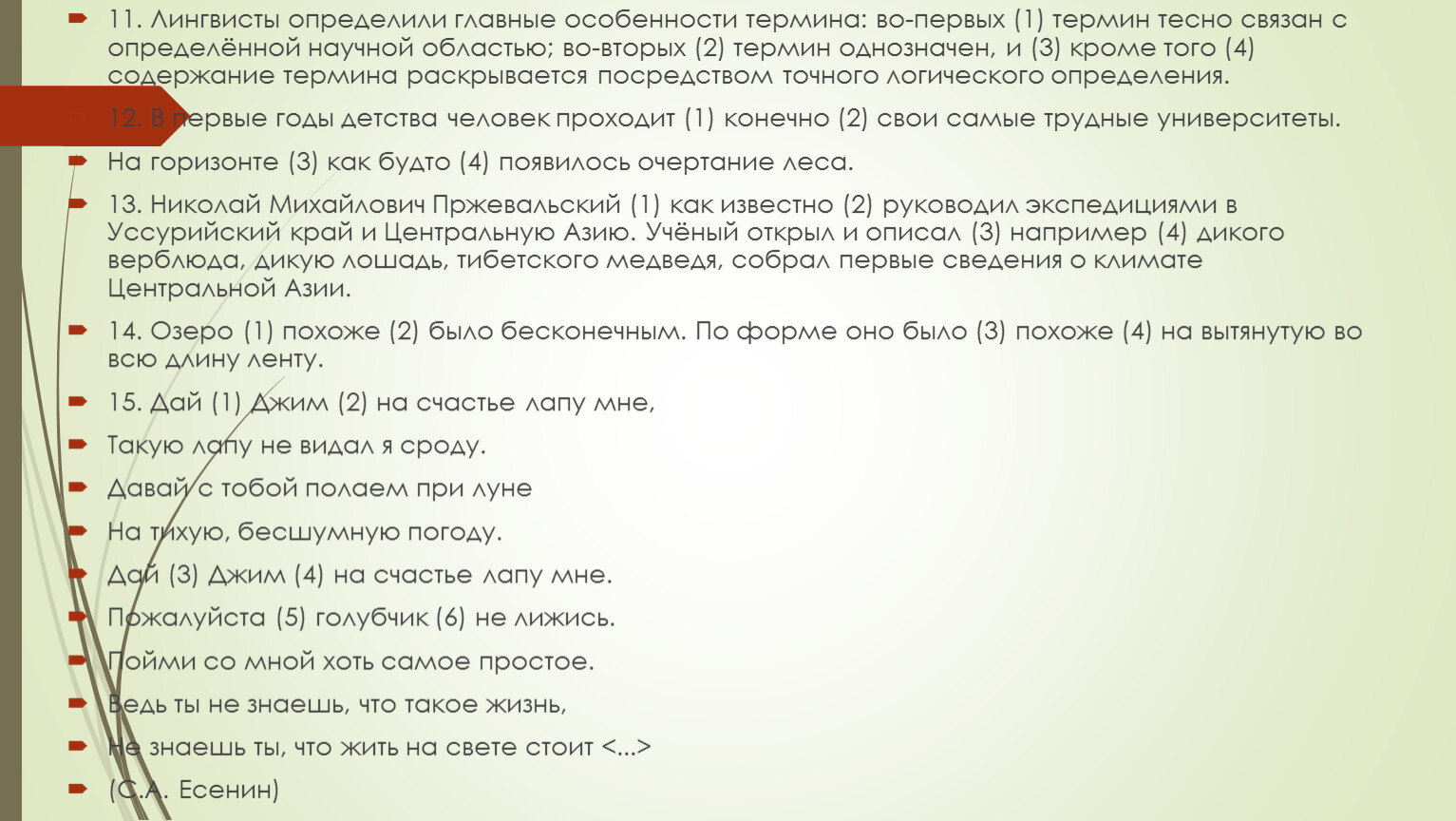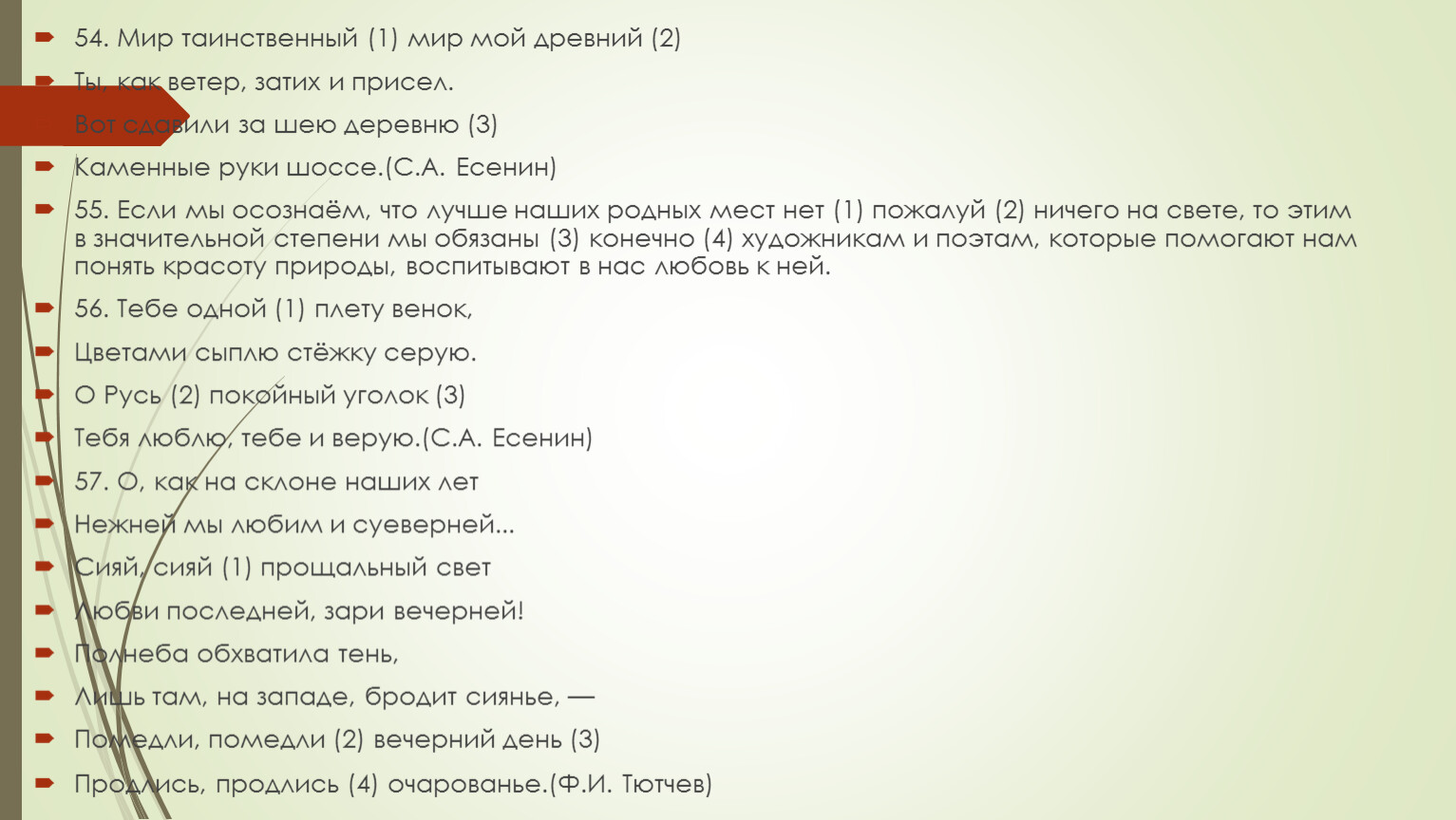Не шуми (5) осина (6) не пыли (7) дорога.