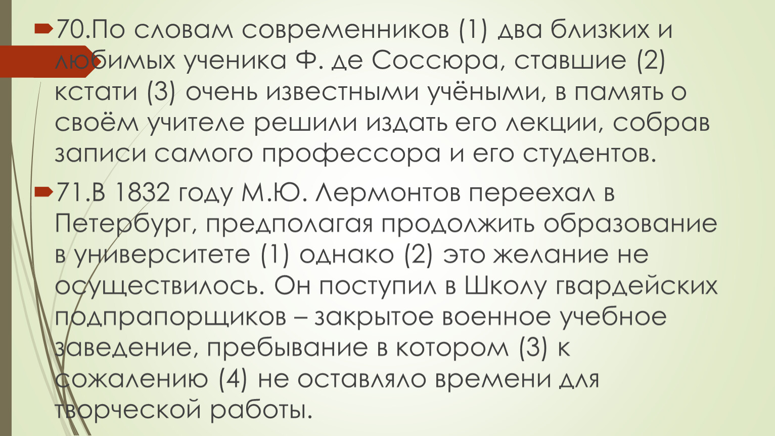 70.По словам современников (1) два близких и любимых ученика Ф. де Соссюра, ставшие (2) кстати (3) очень известными учёными, в память о своём учителе решили издать его лекции, собрав записи самого профессора и его студентов.