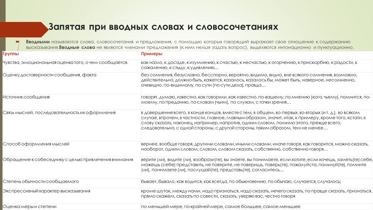 Оценку достоверности сообщения, факта | без сомнения, безусловно, бесспорно, вероятно, видимо, видно, вне всякого сомнения, возможно, действительно, должно быть, кажется, казалось, казалось бы, может быть, наверное, несомненно, очевидно, по-видимому, по сути (по сути дела), правда… |