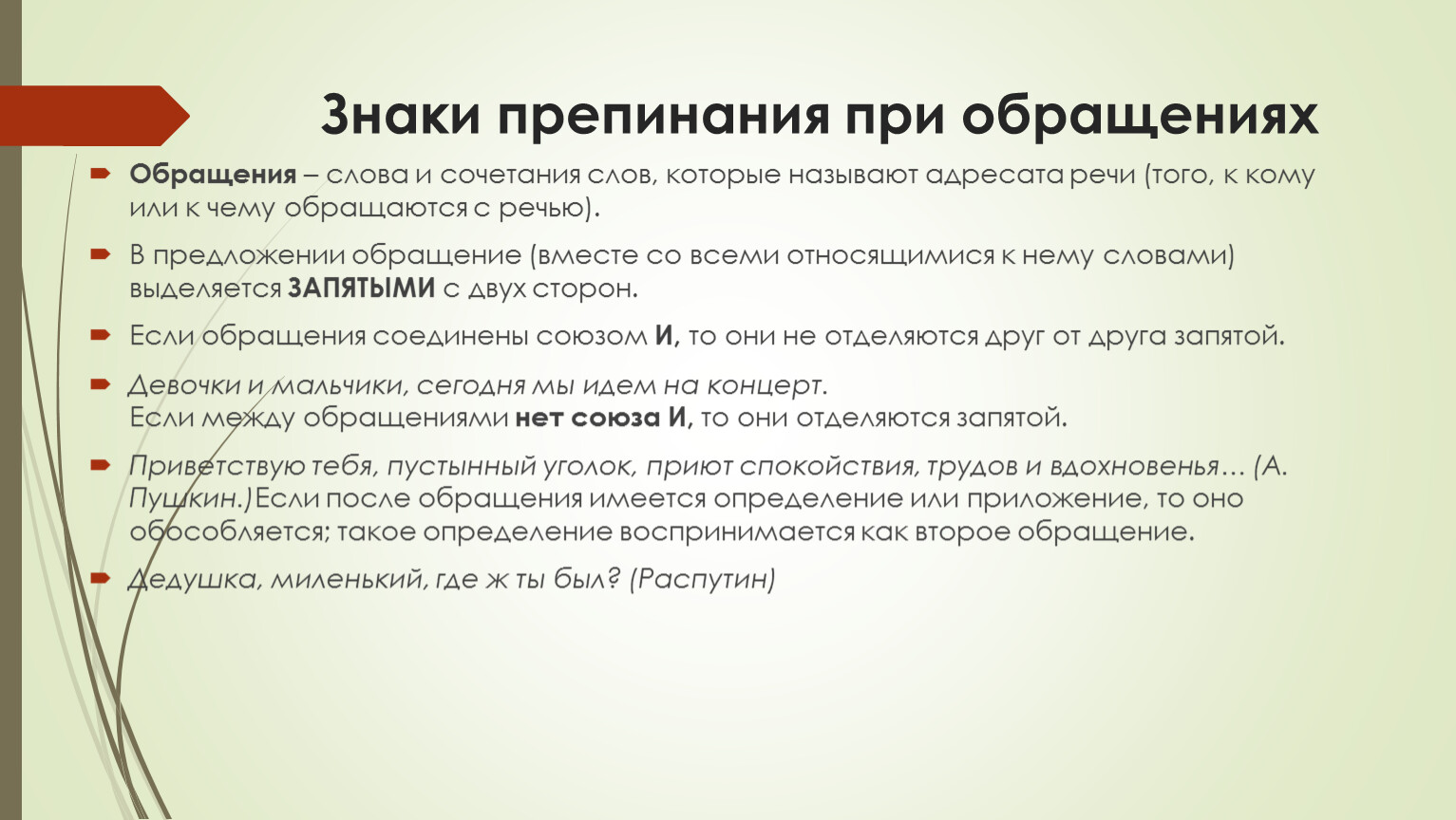 Приветствую тебя, пустынный уголок, приют спокойствия, трудов и вдохновенья… (А. Пушкин.)Если после обращения имеется определение или приложение, то оно обособляется; такое определение воспринимается как второе обращение.
