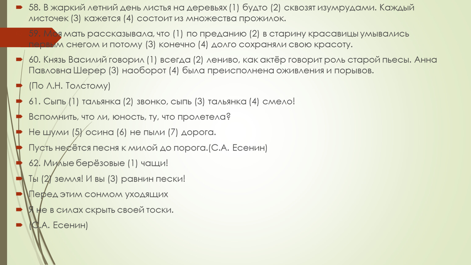 58. В жаркий летний день листья на деревьях (1) будто (2) сквозят изумрудами. Каждый листочек (3) кажется (4) состоит из множества прожилок.
