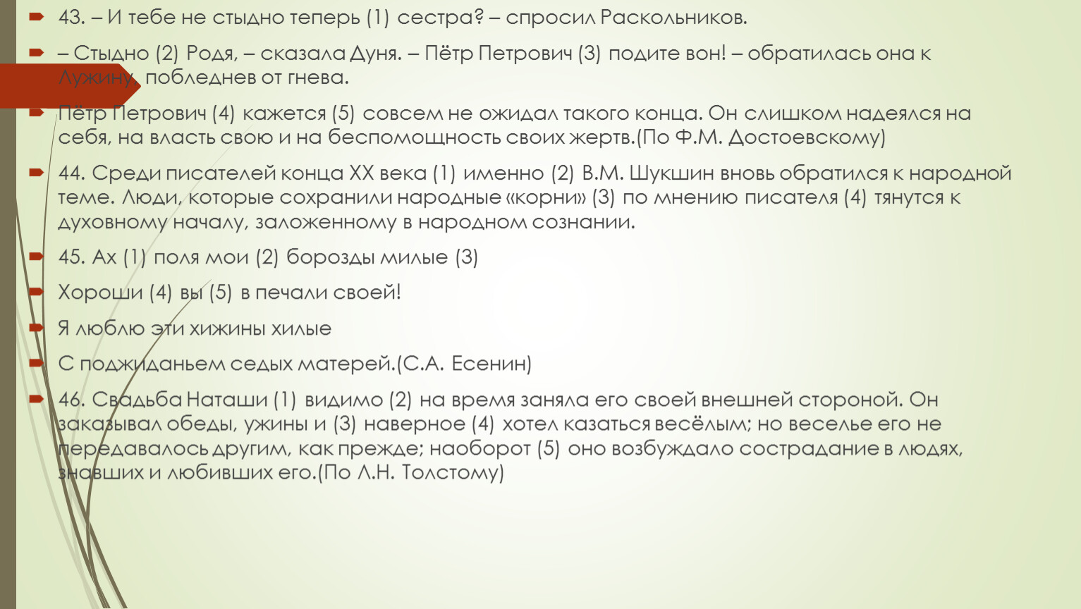 44. Среди писателей конца ХХ века (1) именно (2) В.М. Шукшин вновь обратился к народной теме. Люди, которые сохранили народные «корни» (3) по мнению писателя (4) тянутся к духовному началу, заложенному в народном сознании.