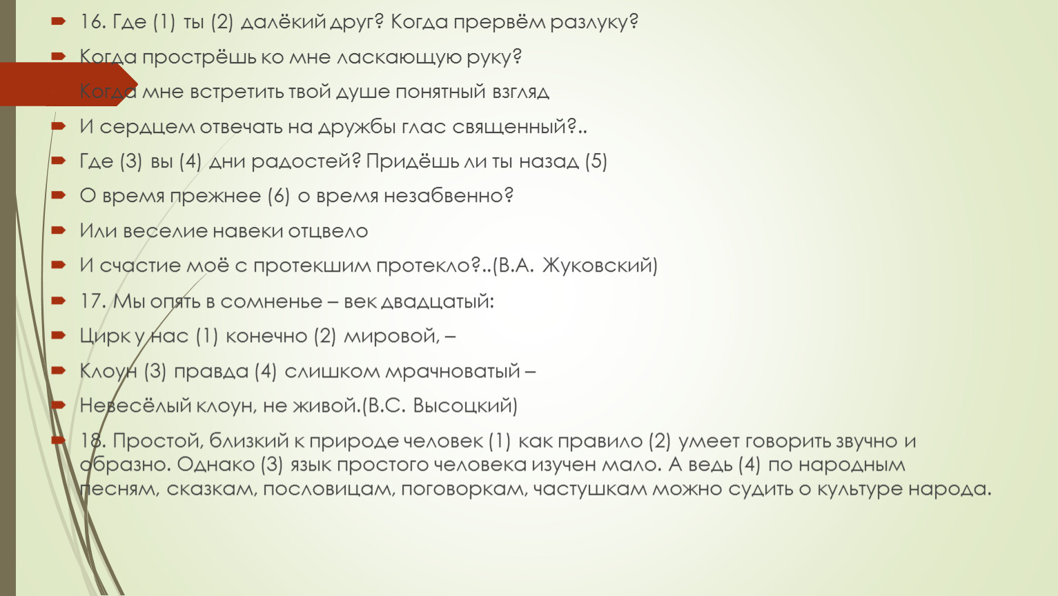 18. Простой, близкий к природе человек (1) как правило (2) умеет говорить звучно и образно. Однако (3) язык простого человека изучен мало. А ведь (4) по народным песням, сказкам, пословицам, поговоркам, частушкам можно судить о культуре народа.