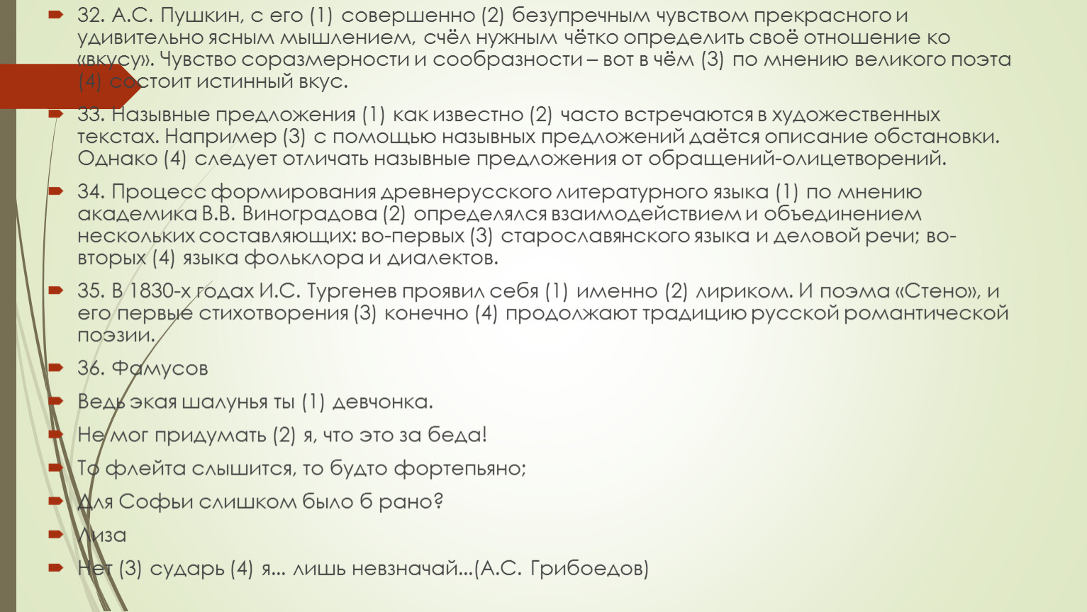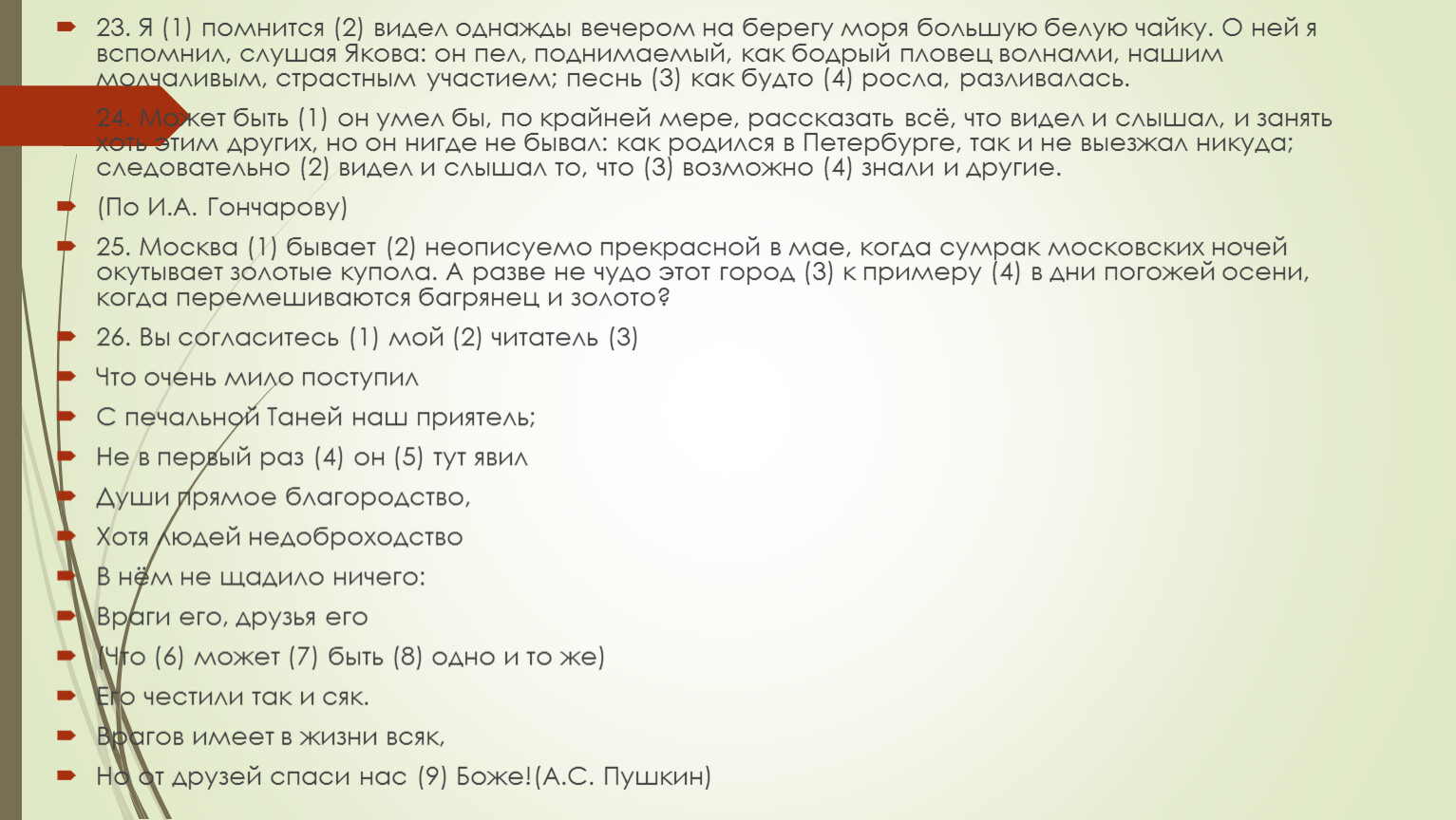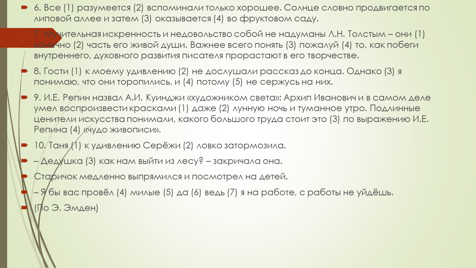 7. Мучительная искренность и недовольство собой не надуманы Л.Н. Толстым – они (1) конечно (2) часть его живой души. Важнее всего понять (3) пожалуй (4) то, как побеги внутреннего, духовного развития писателя прорастают в его творчестве.