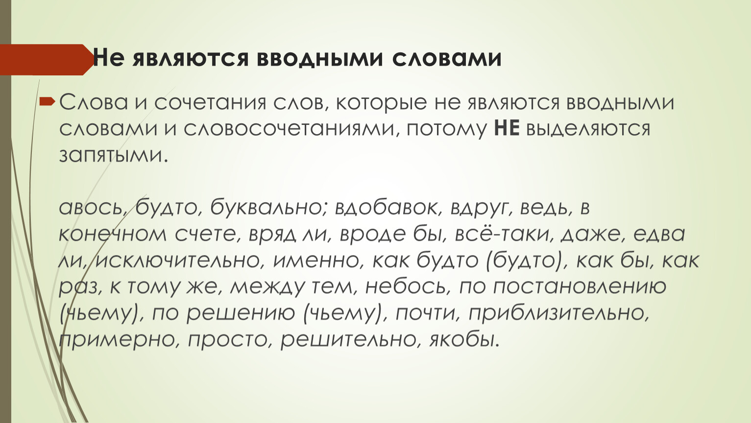 Слова и сочетания слов, которые не являются вводными словами и словосочетаниями, потому НЕ выделяются запятыми.авось, будто, буквально; вдобавок, вдруг, ведь, в конечном счете, вряд ли, вроде бы, всё-таки, даже, едва ли, исключительно, именно, как будто (будто), как бы, как раз, к тому же, между тем, небось, по постановлению (чьему), по решению (чьему), почти, приблизительно, примерно, просто, решительно, якобы.