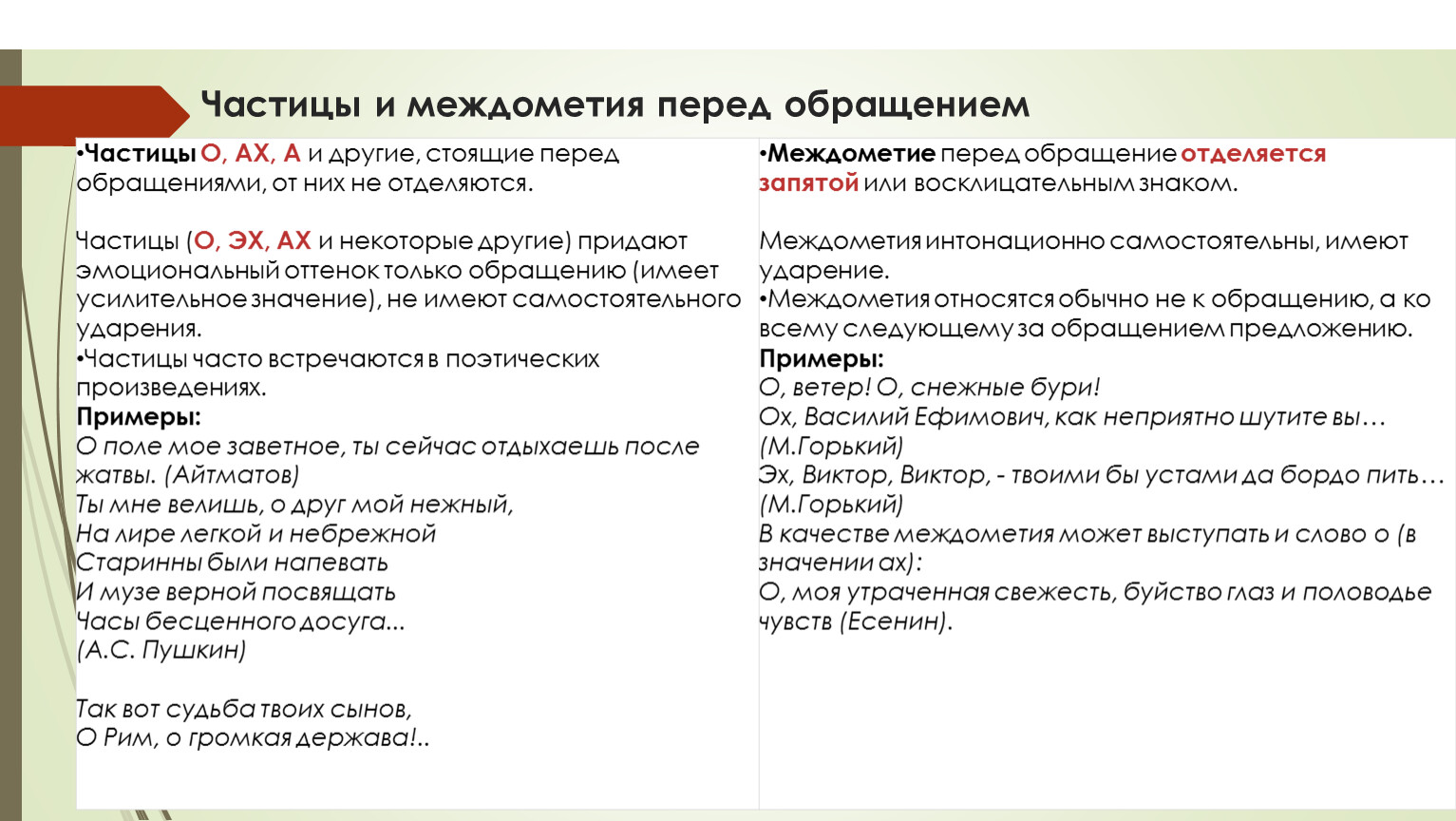 Частицы О, АХ, А и другие, стоящие перед обращениями, от них не отделяются.Частицы (О, ЭХ, АХ и некоторые другие) придают эмоциональный оттенок только обращению (имеет усилительное значение), не имеют самостоятельного ударения. | Междометие перед обращение отделяется запятой или восклицательным знаком.Междометия интонационно самостоятельны, имеют ударение. |
