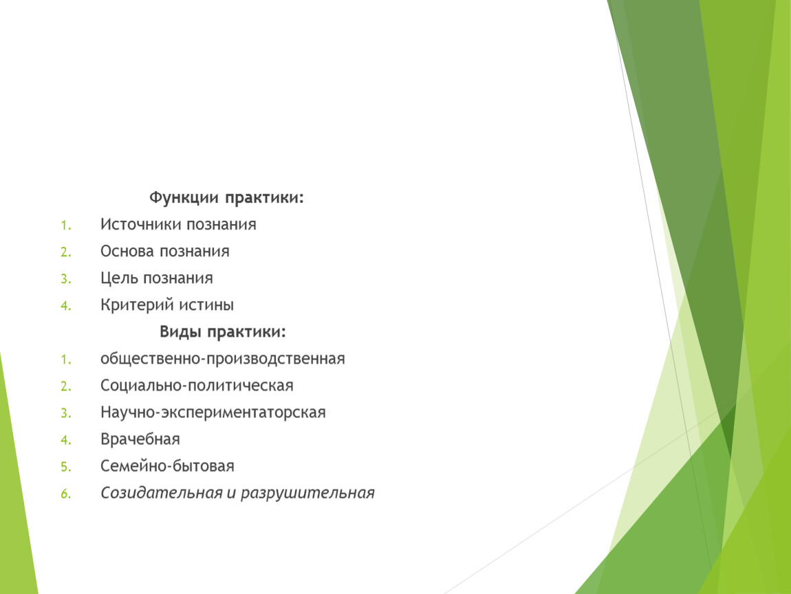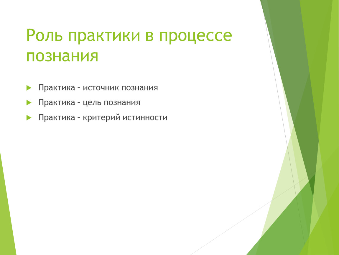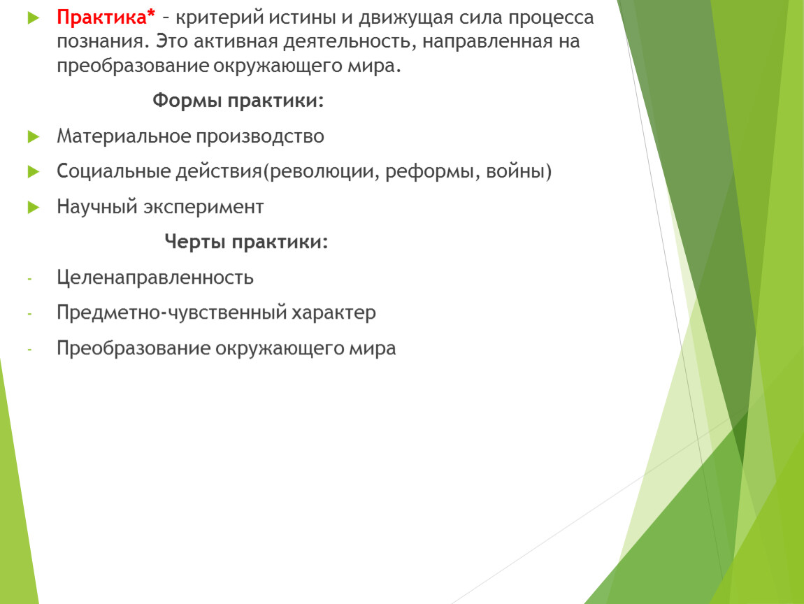 Практика* – критерий истины и движущая сила процесса познания. Это активная деятельность, направленная на преобразование окружающего мира.