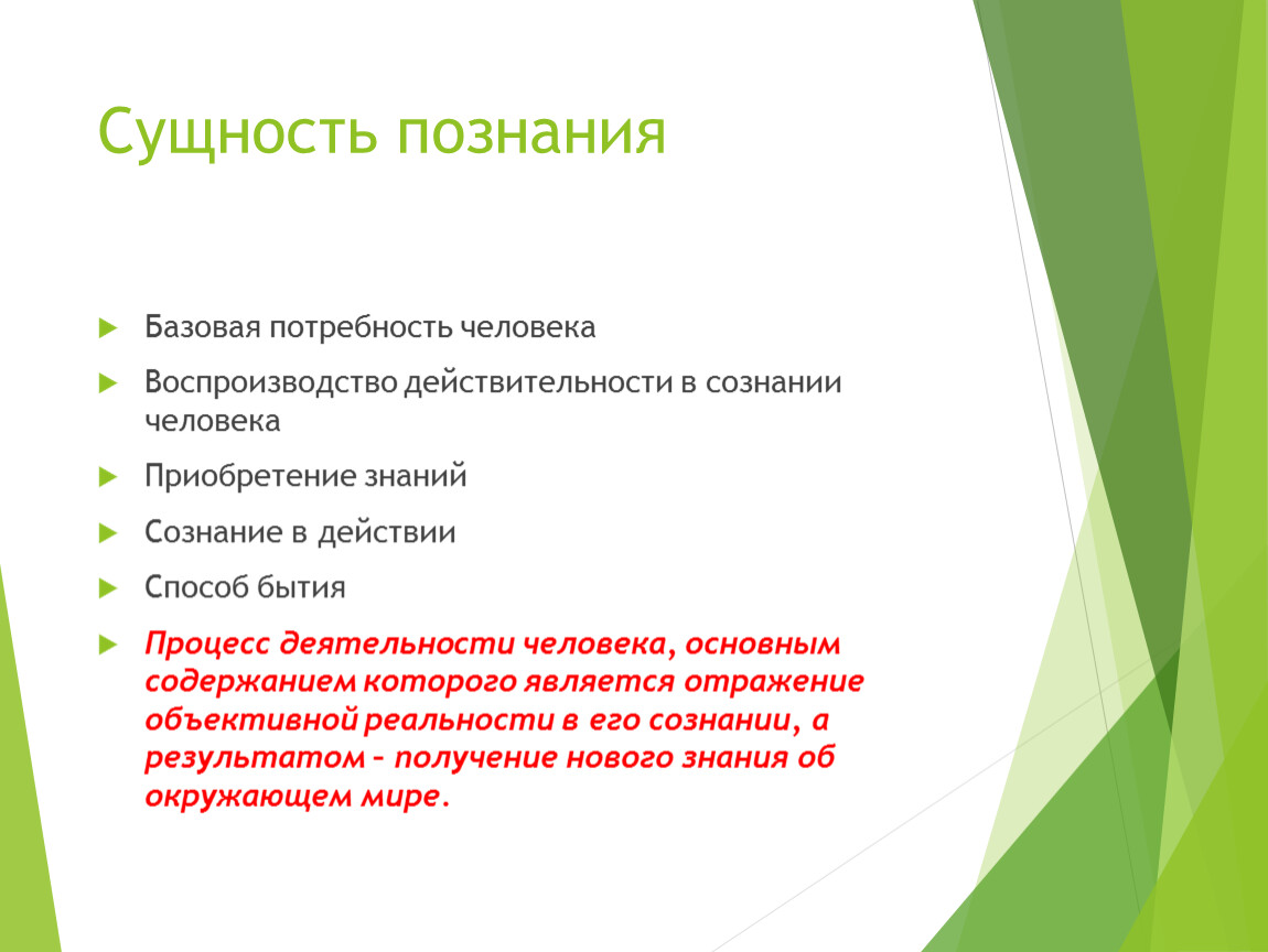 Процесс деятельности человека, основным содержанием которого является отражение объективной реальности в его сознании, а результатом – получение нового знания об окружающем мире.