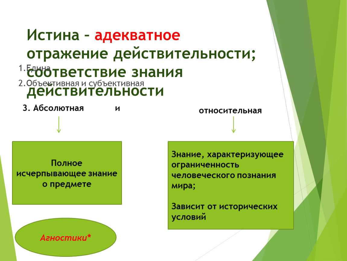 Истина – адекватное отражение действительности; соответствие знания действительности