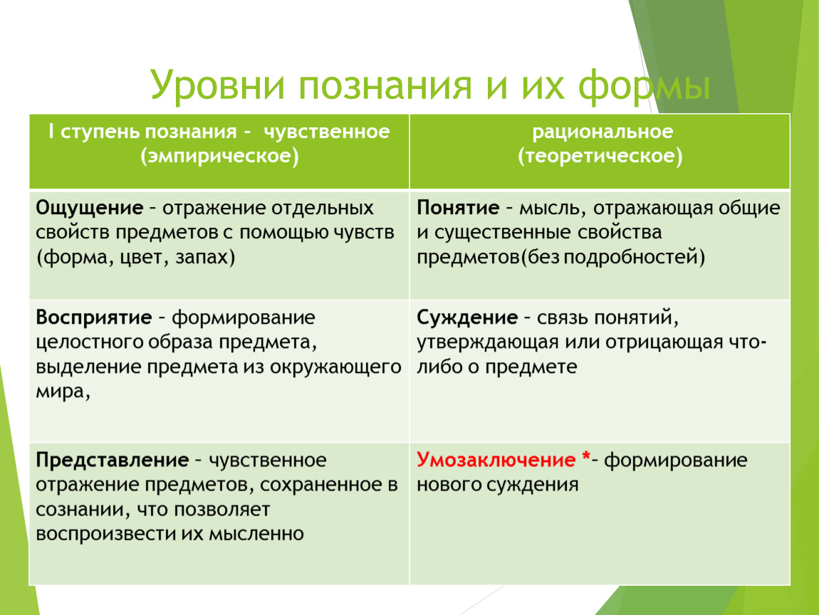Представление – чувственное отражение предметов, сохраненное в сознании, что позволяет воспроизвести их мысленно | Умозаключение *– формирование нового суждения |