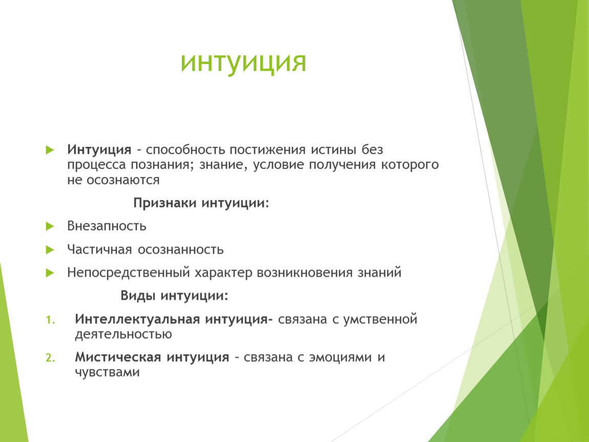 Интуиция – способность постижения истины без процесса познания; знание, условие получения которого не осознаются