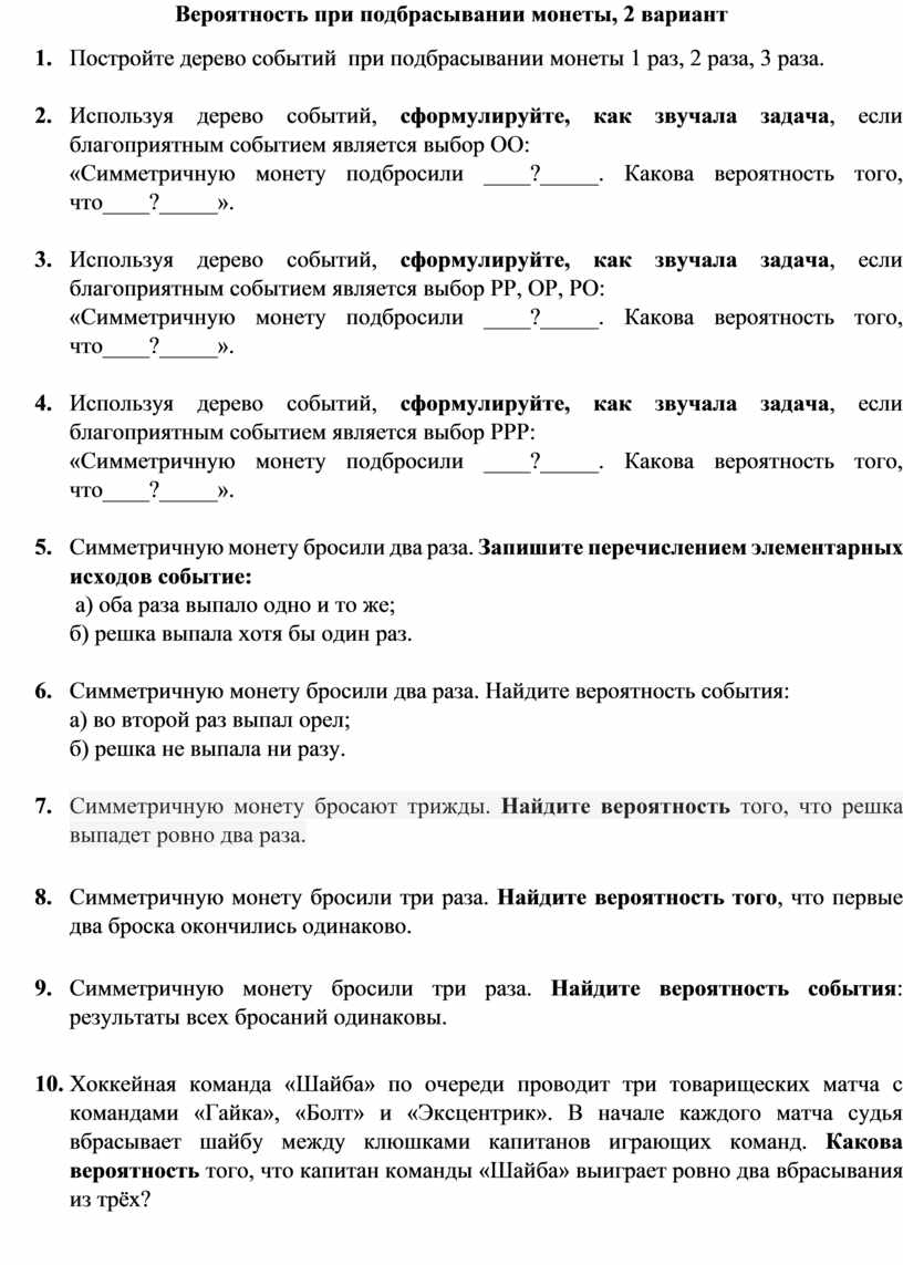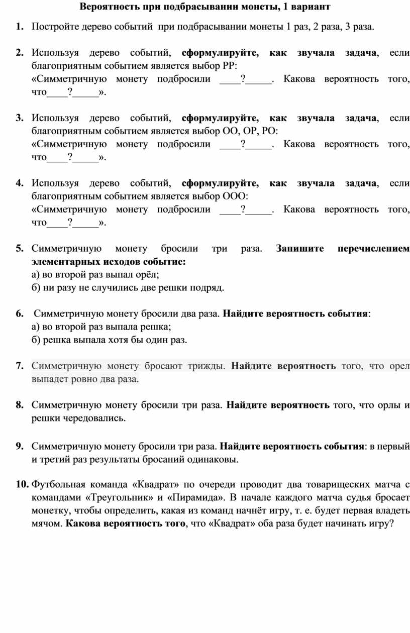 «Симметричную монету подбросили ____?_____. Какова вероятность того, что____?_____».