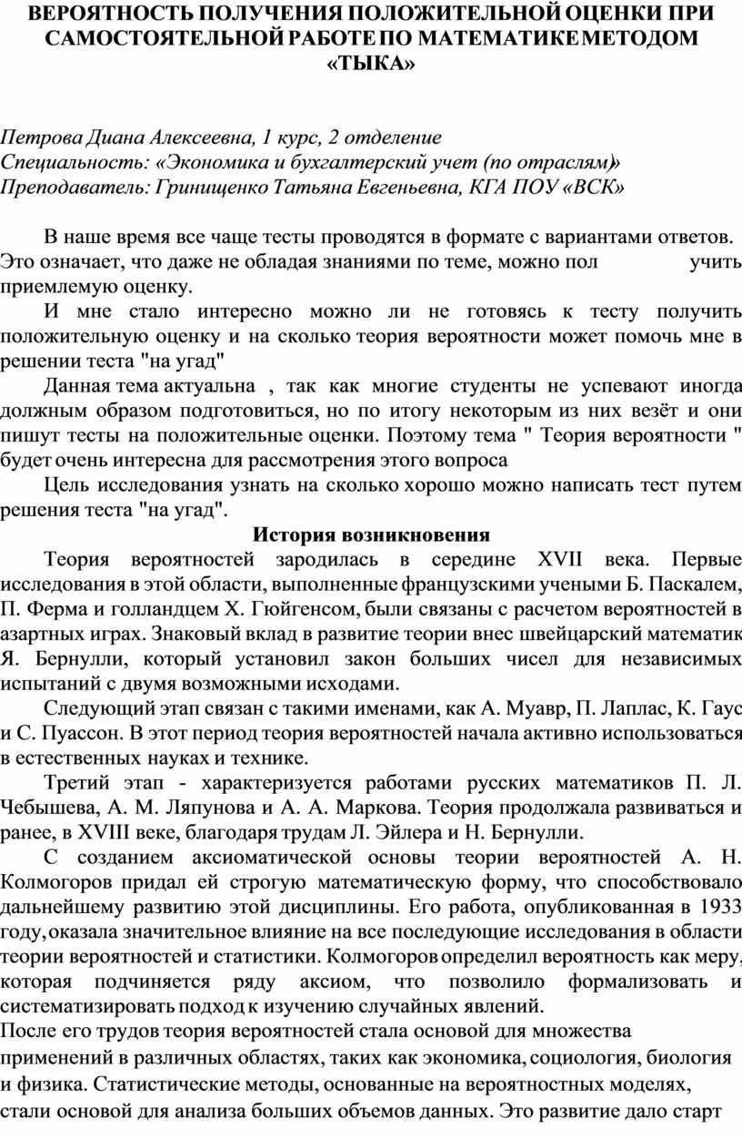 ВЕРОЯТНОСТЬ ПОЛУЧЕНИЯ ПОЛОЖИТЕЛЬНОЙ ОЦЕНКИ ПРИ САМОСТОЯТЕЛЬНОЙ РАБОТЕ ПО МАТЕМАТИКЕ МЕТОДОМ «ТЫКА»
