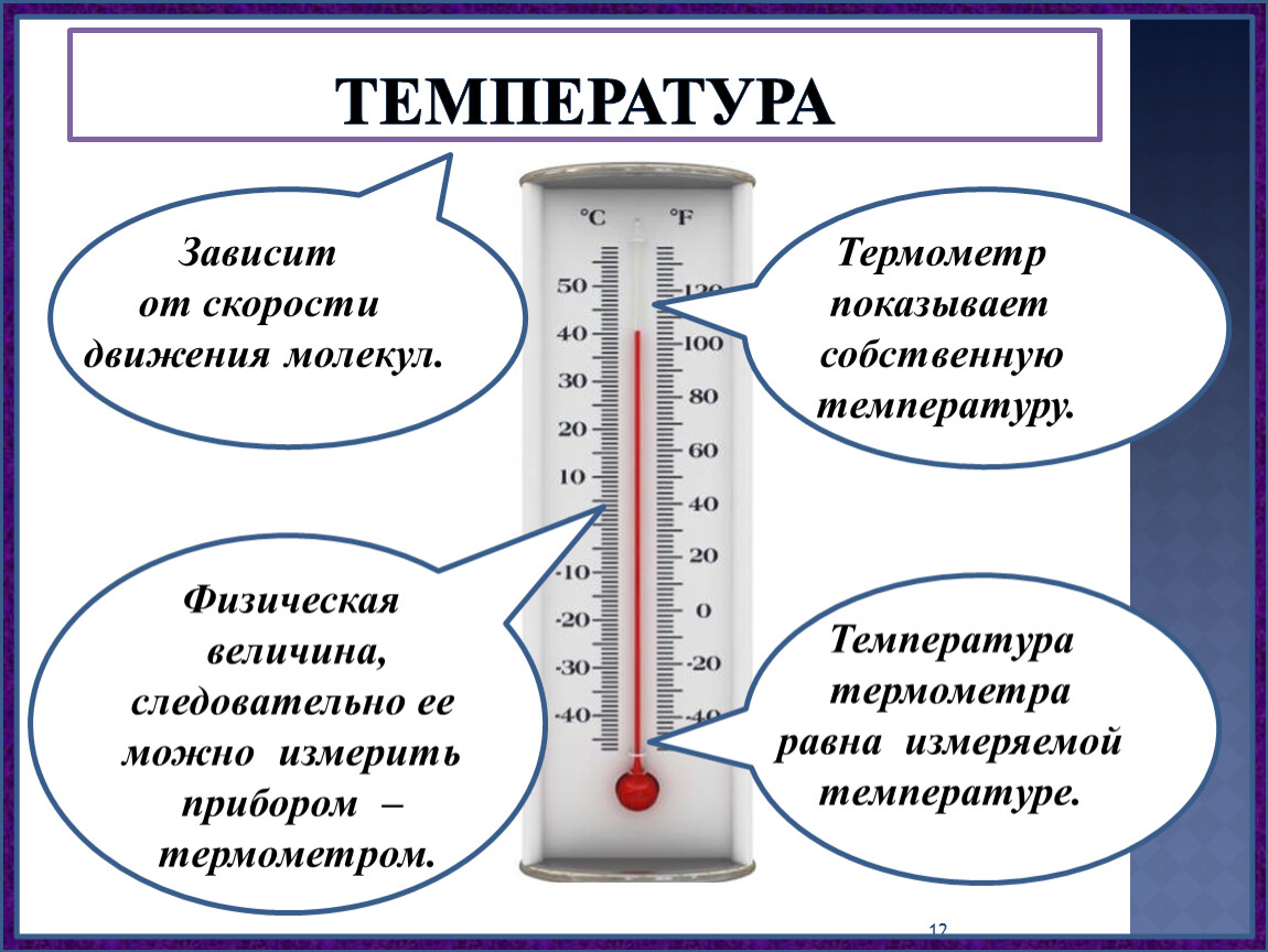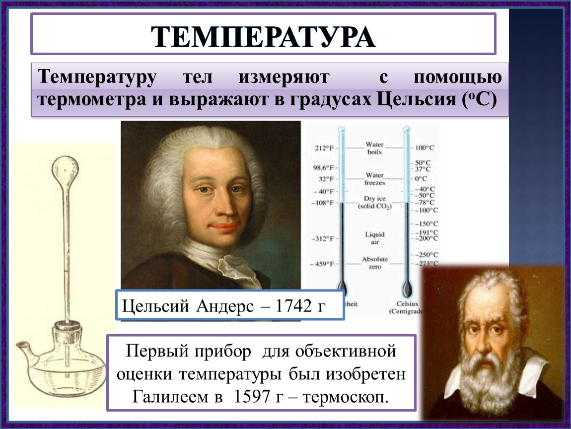 Температуру тел измеряют с помощью термометра и выражают в градусах Цельсия (оС)