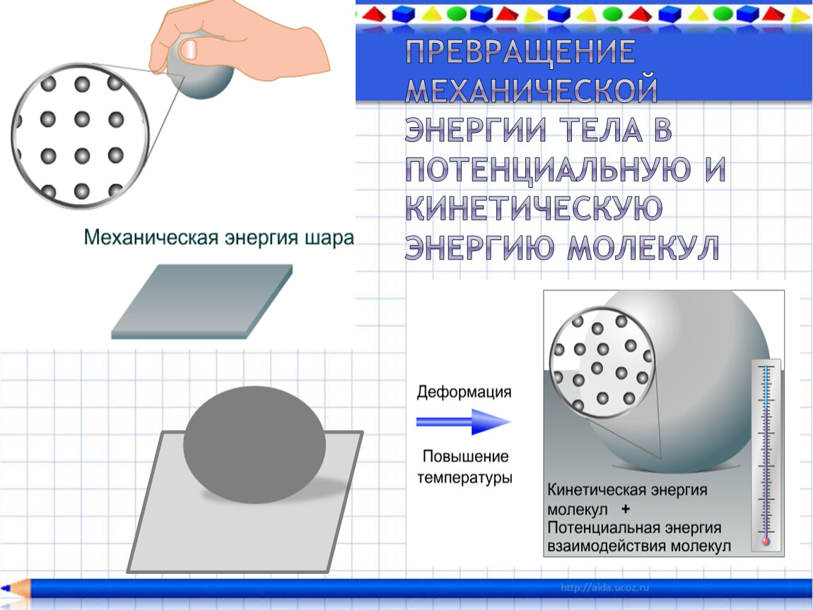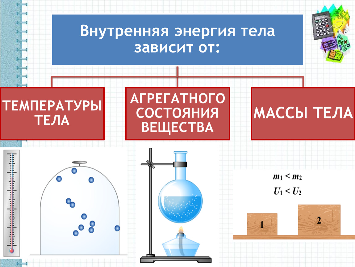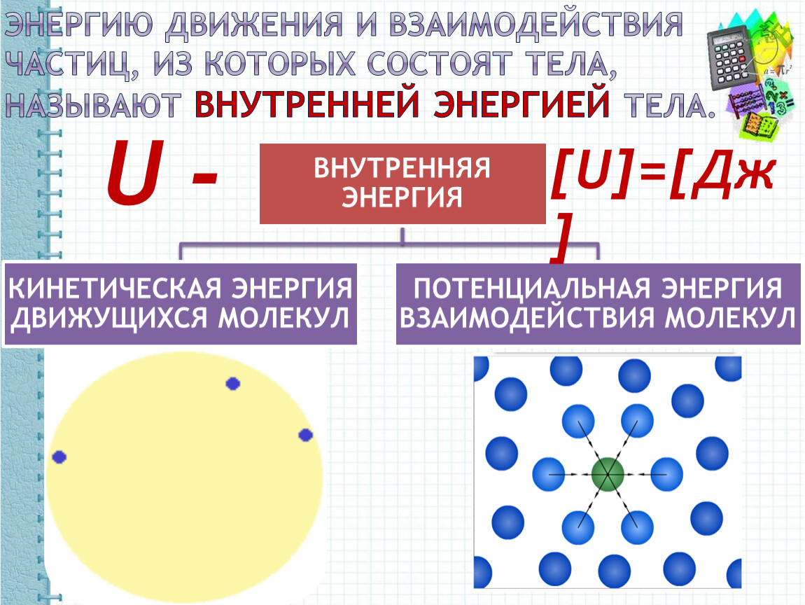 ЭНЕРГИЮ ДВИЖЕНИЯ И ВЗАИМОДЕЙСТВИЯ ЧАСТИЦ, ИЗ КОТОРЫХ СОСТОЯТ ТЕЛА, НАЗЫВАЮТ ВНУТРЕННЕЙ ЭНЕРГИЕЙ ТЕЛА.