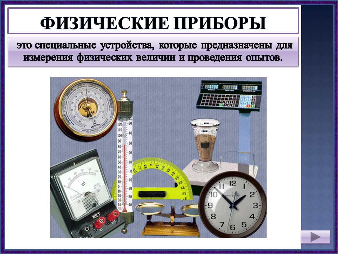 это специальные устройства, которые предназначены для измерения физических величин и проведения опытов.