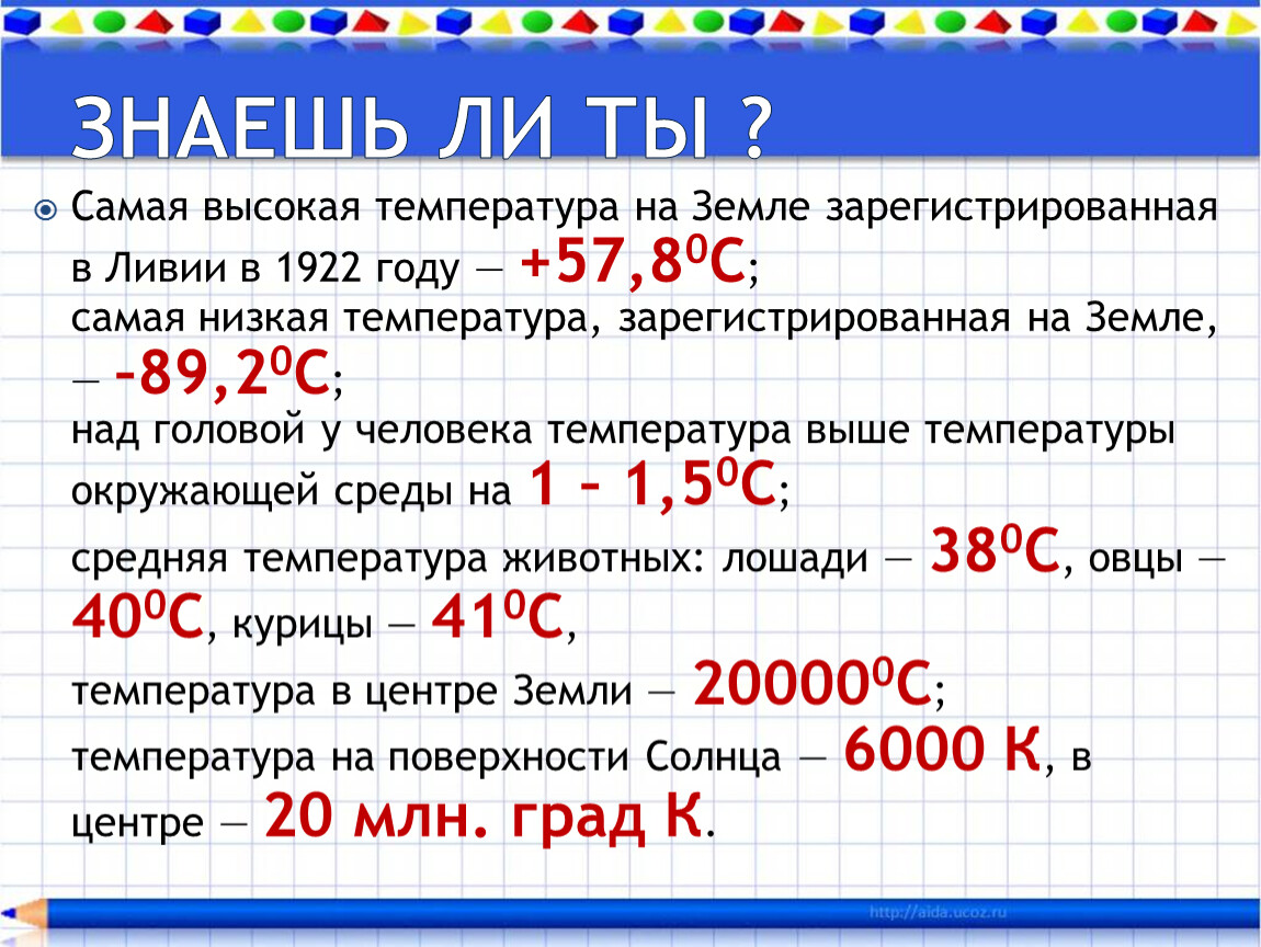 Самая высокая температура на Земле зарегистрированная в Ливии в 1922 году — +57,80С; самая низкая температура, зарегистрированная на Земле, — –89,20С; над головой у человека температура выше температуры окружающей среды на 1 – 1,50С;средняя температура животных: лошади — 380С, овцы — 400С, курицы — 410С, температура в центре Земли — 200000С;температура на поверхности Солнца — 6000 К, в центре — 20 млн. град К.