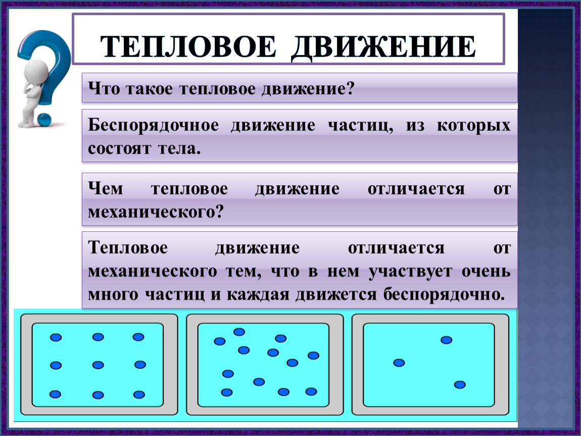 Тепловое движение отличается от механического тем, что в нем участвует очень много частиц и каждая движется беспорядочно.