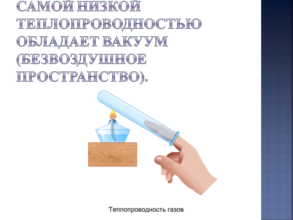 Хуже всех проводят тепло газы.Самой низкой теплопроводностью обладает вакуум (безвоздушное пространство).
