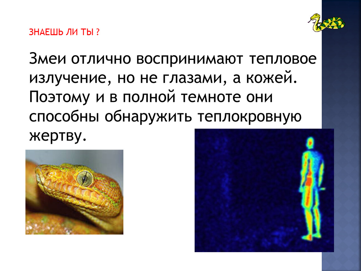 Змеи отлично воспринимают тепловое излучение, но не глазами, а кожей. Поэтому и в полной темноте они способны обнаружить теплокровную жертву.