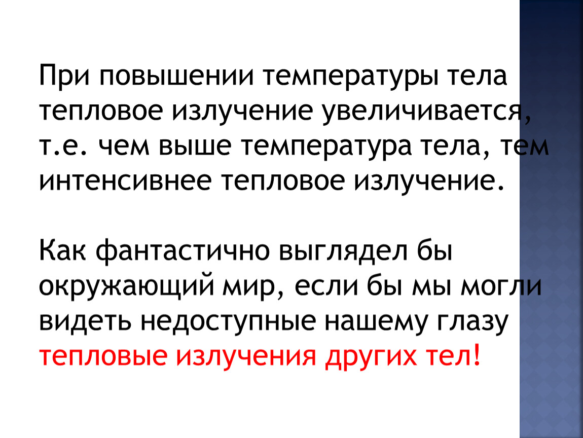 т.е. чем выше температура тела, тем интенсивнее тепловое излучение.