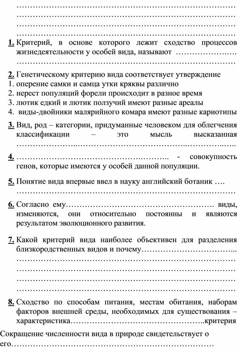 10. Критерий, в основе которого лежит сходство процессов жизнедеятельности у особей вида, называют ……………….….