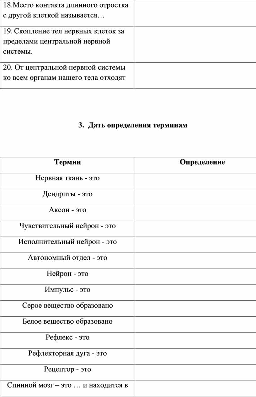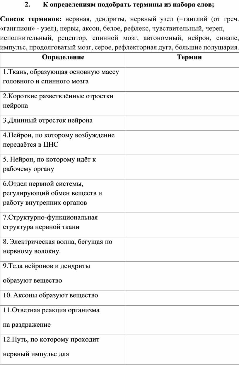 Список терминов: нервная, дендриты, нервный узел (=ганглий (от греч. «ганглион» - узел), нервы, аксон, белое, рефлекс, чувствительный, череп,