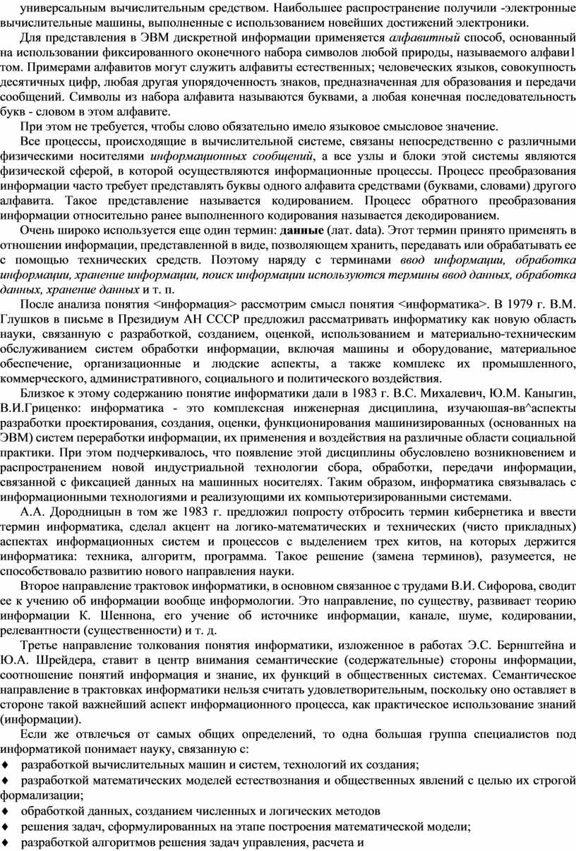 После анализа понятия <информация> рассмотрим смысл понятия <информатика>. В 1979 г. В.М. Глушков в письме в Президиум АН СССР предложил рассматривать информатику как новую область науки, связанную с разработкой, созданием, оценкой, использованием и материально-техническим обслуживанием систем обработки информации, включая машины и оборудование, материальное обеспечение, организационные и людские аспекты, а также комплекс их промышленного, коммерческого, административного, социального и политического воздействия.