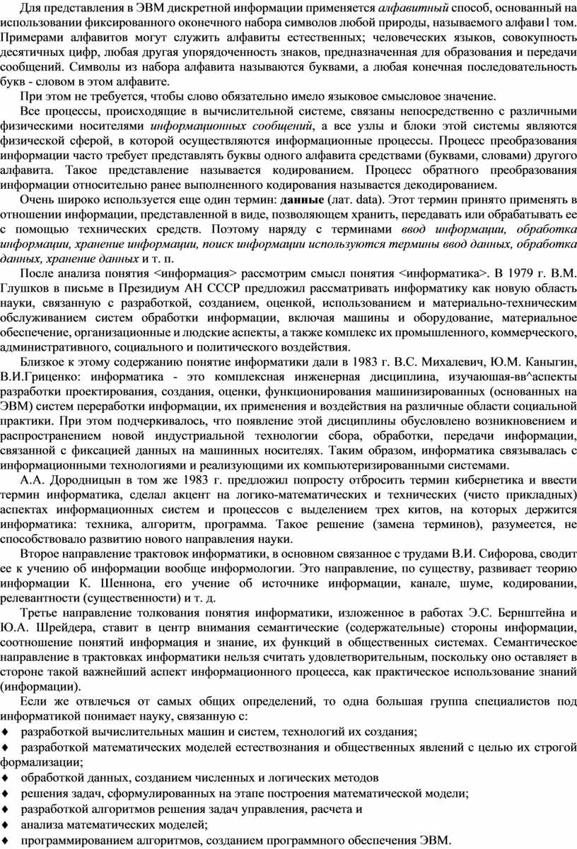 После анализа понятия <информация> рассмотрим смысл понятия <информатика>. В 1979 г. В.М. Глушков в письме в Президиум АН СССР предложил рассматривать информатику как новую область науки, связанную с разработкой, созданием, оценкой, использованием и материально-техническим обслуживанием систем обработки информации, включая машины и оборудование, материальное обеспечение, организационные и людские аспекты, а также комплекс их промышленного, коммерческого, административного, социального и политического воздействия.