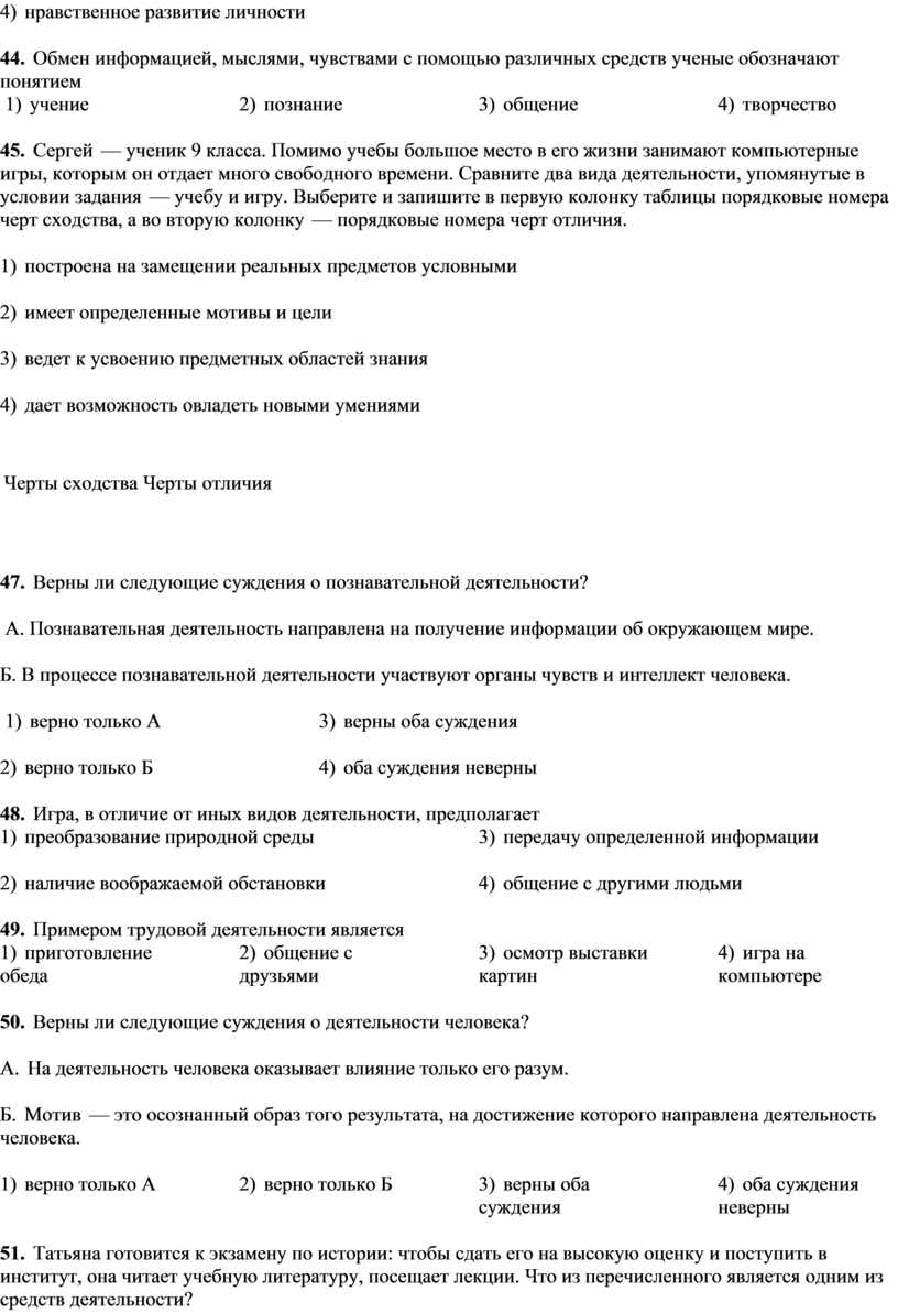 45. Сергей — ученик 9 класса. Помимо учебы большое место в его жизни занимают компьютерные игры, которым он отдает много свободного времени. Сравните два вида деятельности, упомянутые в условии задания — учебу и игру. Выберите и запишите в первую колонку таблицы порядковые номера черт сходства, а во вторую колонку — порядковые номера черт отличия.