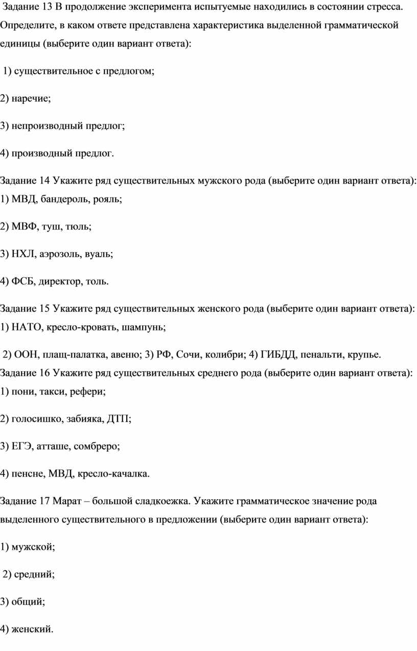 Задание 13 В продолжение эксперимента испытуемые находились в состоянии стресса. Определите, в каком ответе представлена характеристика выделенной грамматической единицы (выберите один вариант ответа):
