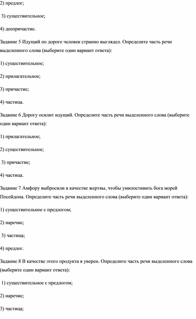 Задание 5 Идущий по дороге человек странно выглядел. Определите часть речи выделенного слова (выберите один вариант ответа):