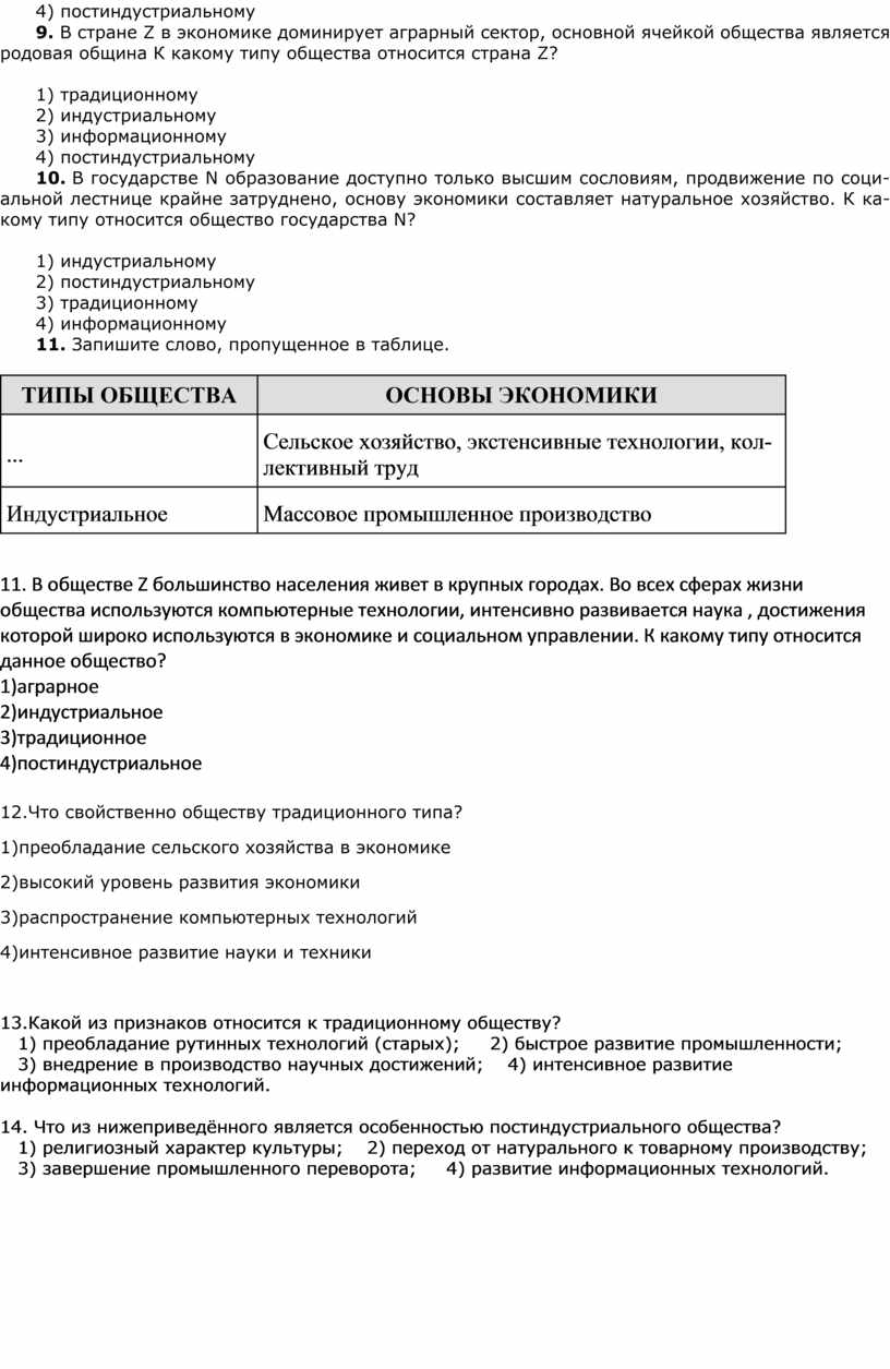 11. В обществе Z большинство населения живет в крупных городах. Во всех сферах жизни общества используются компьютерные технологии, интенсивно развивается наука , достижения которой широко используются в экономике и социальном управлении. К какому типу относится данное общество?