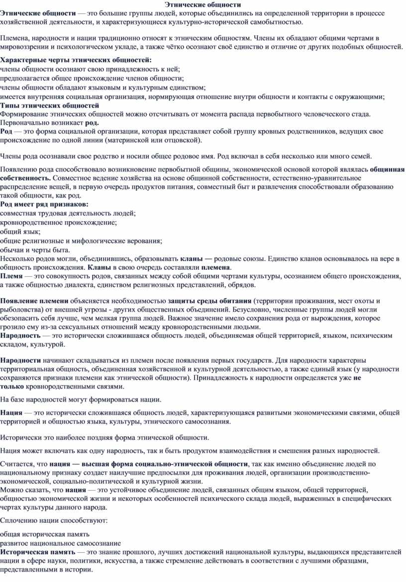 Этнические общности — это большие группы людей, которые объединились на определенной территории в процессе хозяйственной деятельности, и характеризующиеся культурно-исторической самобытностью.