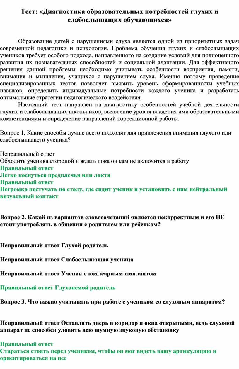 Тест: «Диагностика образовательных потребностей глухих и слабослышащих обучающихся»