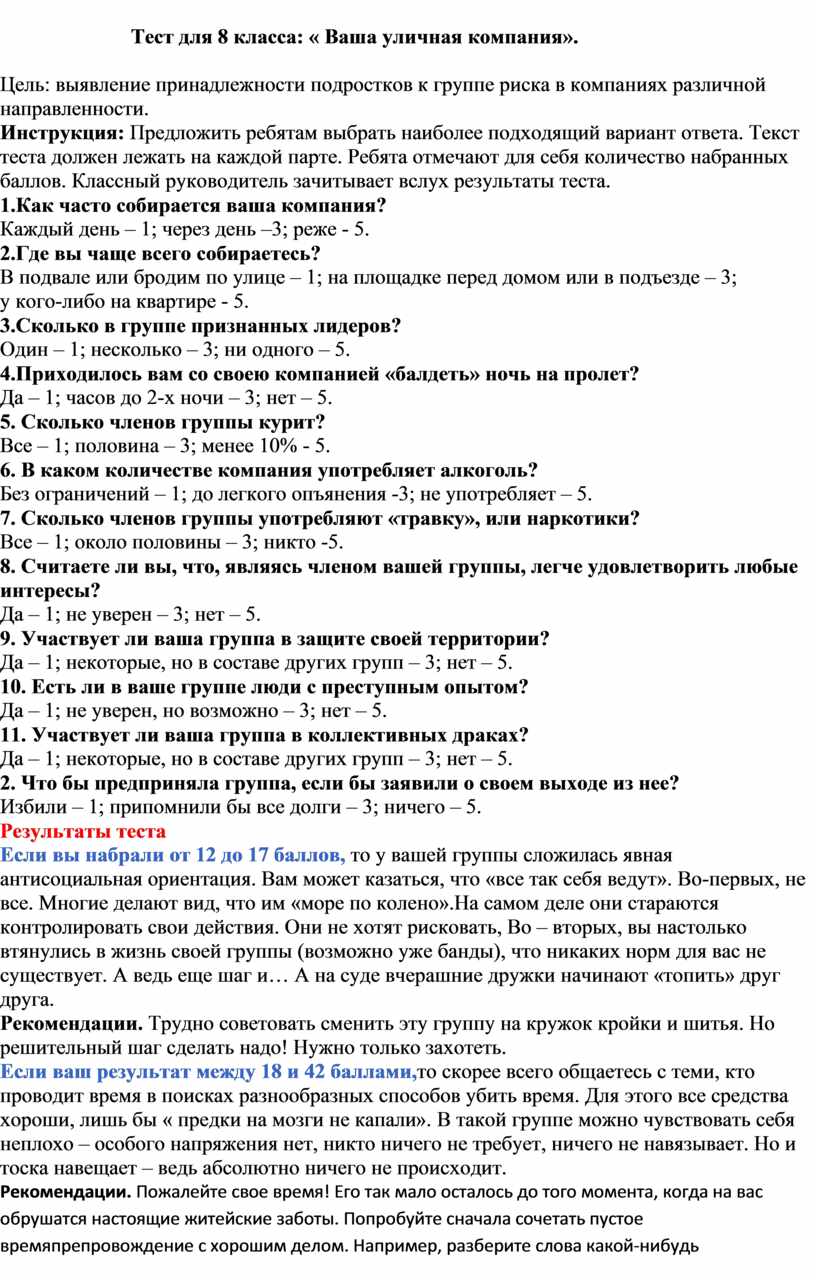 Тест для 8 класса: « Ваша уличная компания».