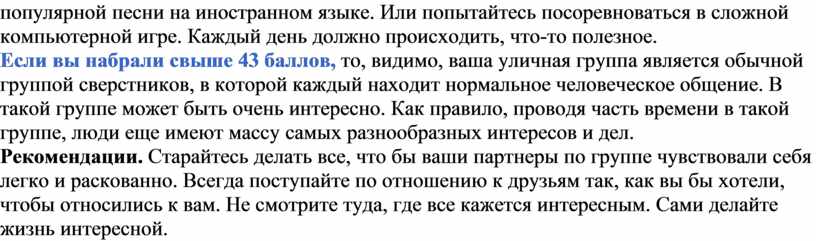 Если вы набрали свыше 43 баллов, то, видимо, ваша уличная группа является обычной группой сверстников, в которой каждый находит нормальное человеческое общение. В такой группе может быть очень интересно. Как правило, проводя часть времени в такой группе, люди еще имеют массу самых разнообразных интересов и дел.