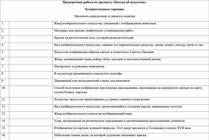Проверочная работа по предмету «Беседы об искусстве» Художественные термины Прочитать определение и записать понятия. |