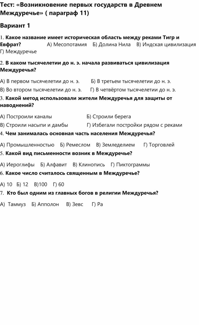 1. Какое название имеет историческая область между реками Тигр и Евфрат? A) Месопотамия Б) Долина Нила В) Индская цивилизация Г) Междуречье