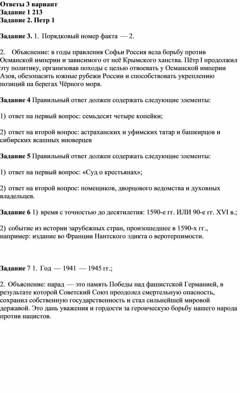 Задание 3. Какой из приведённых исторических фактов можно использовать для аргументации следующей точки зрения: «В начале своего самостоятельного правления Петр I продолжил внешнеполитический курс, взятый в годы правления царевны Софьи»? Укажите порядковый номер этого факта в списке.