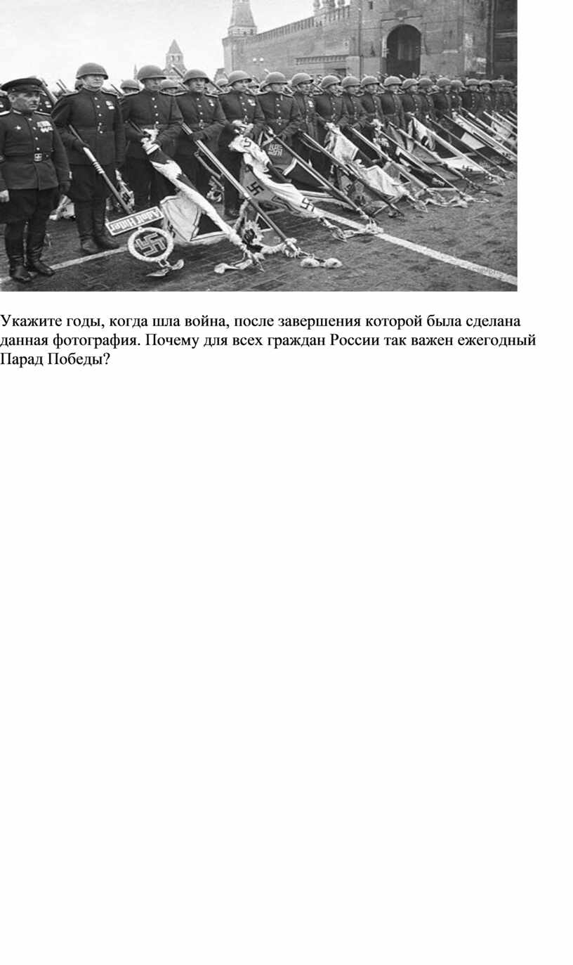 Укажите годы, когда шла война, после завершения которой была сделана данная фотография. Почему для всех граждан России так важен ежегодный Парад Победы?