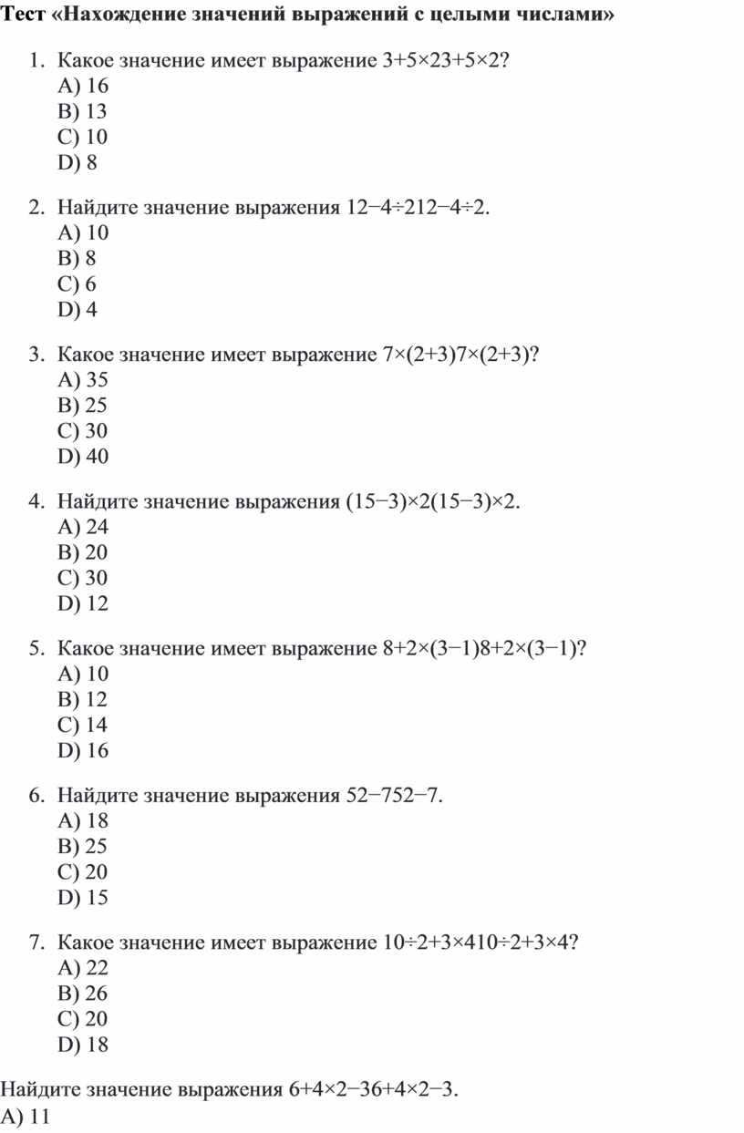 Тест «Нахождение значений выражений с целыми числами»